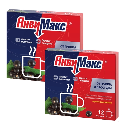 Анвимакс порошок для приготовления раствора вкус чёрная смородина – это комбинированный лекарственный препарат, который , обладает противовирусным, интерфероногенным, жаропонижающим, обезболивающим, антигистаминным и ангиопротекторным действием. Применяется для лечения гриппа типа А, симптоматическое лечение «простудных» заболеваний, гриппа и ОРВИ, сопровождающиеся повышенной температурой, ознобом, заложенностью носа, болью в горле, болями в суставах и мышцах, головной болью. Выпускается в форме порошка, 5 г в саше - 12 штук в упаковке. Растворить содержимое одного пакетика в половине стакана (100 мл) кипяченой теплой воды. Употребить сразу после растворения. Перед употреблением раствор размешать. Взрослым: принимать по 1 пакетику 2-3 раза в сутки после еды. Интервал между приемами препарата - 4-6 часов. Курс терапии 3-5 дней до исчезновения симптомов заболевания. АнвиМакс не следует принимать более 5 дней. Перед применением рекомендуется проконсультироваться с врачом.