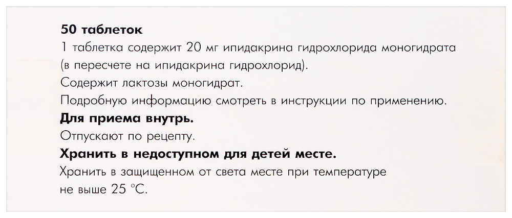 ипидакрин 20 мг Вспомогательные вещества: лактоза, крахмал картофельный, кальция стеарат