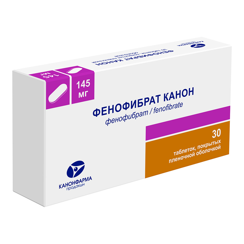 Фенофибрат Канон 145 мг таблетки покрытые пленочной оболочкой содержат 145 мг микронизированного фенофибрата. Препарат Фенофибрат Канон в виде микронизированного фенофибрата обладает более высокой биодоступностью. Исходный фенофибрат в плазме крови не обнаруживается. Основным плазменным метаболитом является фенофиброевая кислота. Всасывание: максимальная концентрация в плазме крови (Сmах) достигается через 4-5 часов после приема внутрь. При длительном применении концентрация препарата в плазме крови остается стабильной. Всасывание фенофибрата усиливается при одновременном приеме с пищей. Распределение: фенофиброевая кислота прочно связывается с альбумином плазмы крови (более 99 %). Период полувыведения: период полувыведения фенофиброевой кислоты (Т1/2) - около 20 часов. Метаболизм и выведение: в плазме крови обнаруживается только основной метаболит фенофибрата - фенофиброевая кислота. Фенофибрат не является субстратом для изофермента CYP3А4. Не принимает участия в микросомальном метаболизме. Выводится, главным образом, почками в виде фенофиброевой кислоты и конъюгата глюкуронида. В течение 6 дней фенофибрат выводится практически полностью. Общий клиренс фенофиброевой кислоты, определяемый у пожилых пациентов не изменяется. Препарат не кумулируется после однократного приема и при длительном применении. При гемодиализе не выводитс