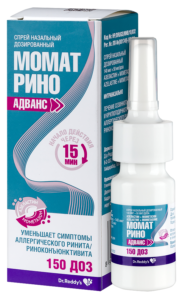 Внимательно прочитайте эту инструкцию перед тем, как начать применение этого препарата, так как она содержит важную для Вас информацию. • Сохраняйте инструкцию, она может понадобиться вновь. • Если у Вас возникли вопросы, обратитесь к врачу. • Лекарственное средство, которым Вы лечитесь, предназначено лично Вам, и его не следует передавать другим лицам, поскольку оно может причинить им вред даже при наличии тех же симптомов, что и у Вас. Препарат показан только для интраназального применения. Если Вы уже принимаете по отдельности препараты азеластина и мометазона в нос, то теперь вместо них удобнее использовать лишь один препарат - комбинированный спрей назальный Момат Рино Адванс. Пациенты, принимающие по отдельности антигистаминные препараты или интраназальные глюкокортикостероиды и у которых сохраняются проявления аллергического ринита/риноконъюнктивита, могут применять комбинированный препарат Момат Рино Адванс для более эффективной терапии. Пациенты с симптомами аллергического ринита, значительно ухудшающими качество жизни, препятствующими нормальной дневной активности (работа, учеба) и нарушающими сон, могут применять препарат Момат Рино Адванс. Препарат Момат Рино Адванс не следует использовать более 3 месяцев. В случае необходимости применения препарата более 3 месяцев необходима консультация врача. Как и при любом долгосрочном лечении, пациенты, применяющие препарат Момат Рино Адванс в течение нескольких месяцев и дольше, должны периодически проходить осмотр у врача на предмет возможных изменений слизистой оболочки носа. Азеластина гидрохлорид В отдельных случаях при применении назального спрея наблюдается усталость различной степени выраженности и слабость, которые могут быть вызваны также и основным заболеванием. Употребление алкоголя может усилить эти явления. Мометазона фуроат Следует проконсультироваться с врачом перед применением мометазона у пациентов с туберкулезной инфекцией (активной или латентной) респираторного тракта, нелеченой грибковой, бактериальной, системной вирусной инфекцией или инфекцией, вызванной Herpes simplex с поражением глаз (в виде исключения возможно назначение препарата при перечисленных инфекциях по указанию врача), наличии нелеченой инфекции с вовлечением в процесс слизистой оболочки носовой полости. Необходимо проводить наблюдение за пациентами, получающими интраназальные ГКС длительное время. Возможно развитие задержки роста у детей. В случае возникновения каких-либо изменений необходимо уведомить врача. В случае развития местной грибковой инфекции носа или глотки может потребоваться прекращение терапии препаратом Момат Рино Адванс и проведение специального лечения. Сохраняющееся в течение длительного времени раздражение слизистой оболочки носа и глотки также может служить основанием для прекращения лечения препаратом Момат Рино Адванс. Если у пациента появляются такие симптомы, как нарушение четкости зрения или другие зрительные нарушения, он должен быть направлен к офтальмологу для оценки возможных причин, которые могут включать катаракту, глаукому или редкие заболевания, такие как центральная серозная хориоретинопатия (CSCR), развитие которых регистрировалось после использования системных и местных глюкокортикостероидов. При применении мо