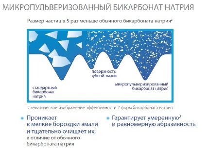 • Содержит микропульверизированный бикарбонат натрия, который удаляет пятна с поверхности зубов, не повреждая зубную эмаль. RDA (индекс абразивности, чем он выше, тем выше вероятность повреждения зубной эмали) всего 88, то есть зубная паста не травмирует эмаль зубов.