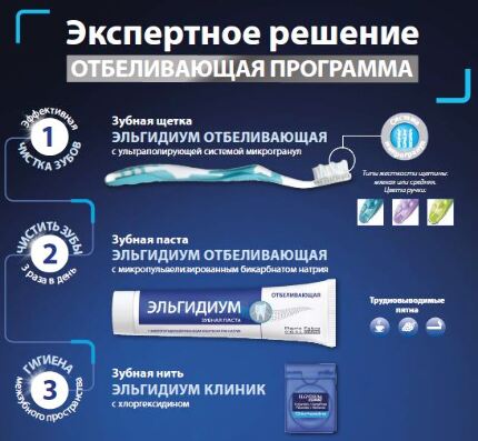 Вместе с пастой рекомендуется использовать зубную щетку «Эльгидиум отбеливающая» с системой микрогранул в щетинках, которые полируют зубы, придавая им блеск и зубную нить «Эльгидиум клиник» с хлоргексидином.