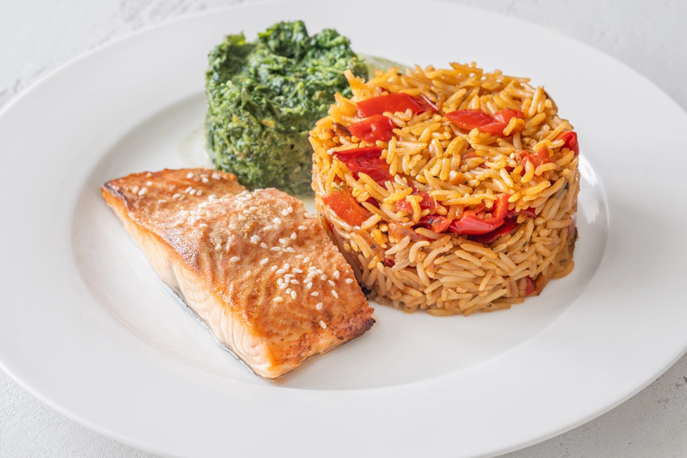 Используйте разнообразие ярких цветов. Например, положите на тарелку оранжевый запечённый лосось, белый рис, красный болгарский перец, зелёный соус из шпината. Контраст цветов сразу привлекает внимание.