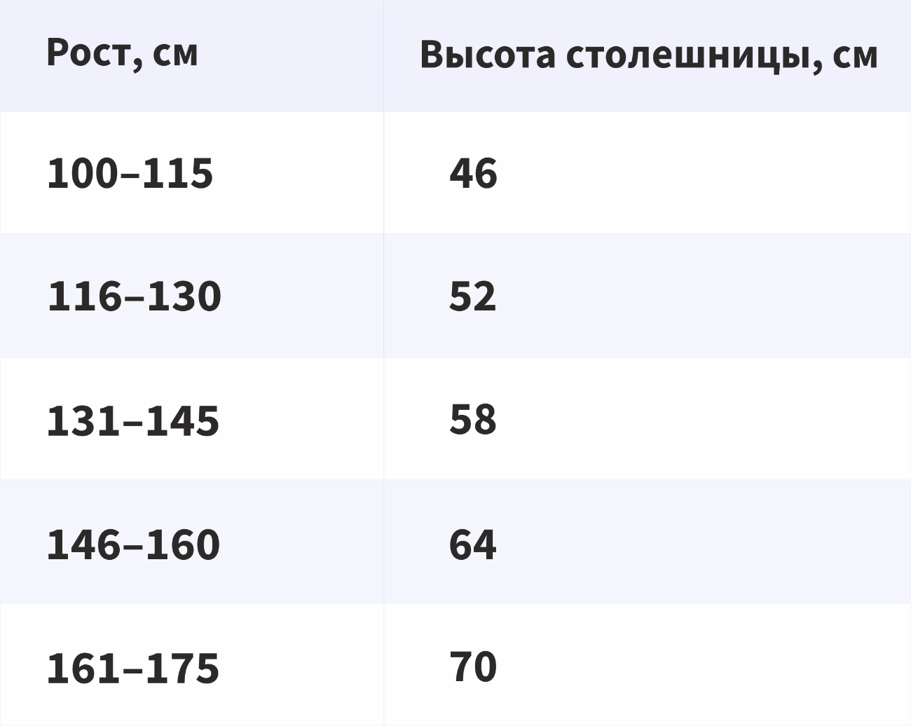 Желательно, чтобы высоту столешницы можно было регулировать, так как она зависит от роста ребёнка. Ориентироваться можно на таблицу, приведённую ниже.