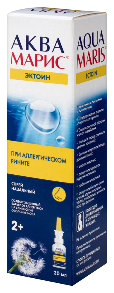 Спрей назальный Аква Марис® Эктоин - это полностью натуральное средство, которое создает физическое препятствие («барьер») для прикрепления аллергенов к слизистой оболочке носа. Аква Марис® Эктоин защищает от развития аллергии, препятствует развитию аллергического ринита и способствует восстановлению слизистой оболочки носа, повреждённой под воздействием аллергенов. Спрей назальный Аква Марис® Эктоин содержит комбинацию эктоина и изотонического раствора морской соли. Эктоин является компонентом, который в природных условиях вырабатывают галофильные микроорганизмы, способные существовать в чрезвычайно неблагоприятных условиях внешней среды. Благодаря высокой гидрофильности (сродство к молекулам воды), эктоин образует с ними прочные кластеры, формируя неощутимый защитный «эктоин гидрокомплекс» на поверхности слизистой оболочки носа. Данный комплекс препятствует контакту аллергенов с клетками слизистой оболочки носа, защищая от возникновения аллергической реакции и снижая выраженность проявлений аллергического ринита. При этом аллергены фиксируются на поверхности гидрокомплекса и могут быть эффективно удалены из полости носа при промывании или высмаркивании. Раствор натуральной морской соли, входящий в состав Аква Марис® Эктоин, способствует механическому удалению аллергенов с поверхности слизистой оболочки носа и очищает ее поверхность от осевшей уличной и домашней пыли. Микроэлементы и минералы морской соли улучшают функцию мерцательного эпителия, оказывают противовоспалительное и восстановительное действие на слизистую оболочку полости носа. Аква Марис® Эктоин не вызывает привыкания. Продолжительность применения не ограничена. ПОКАЗАНИЯ К ПРИМЕНЕНИЮ: Защита слизистой оболочки носа от воздействия: -пыльцы (в период сезонного цветения растений); -бытовых аллергенов (клещи домашней пыли); -шерсти животных; -аллергенов тараканов и других насекомых; -грибковых аллергенов; -аллергенов бытовой химии, а также других инородных частиц, попадающих в полость носа при дыхании. Симптоматическое лечение аллергического ринита с целью уменьшения выраженности зуда, чихания, насморка, слезотечения и заложенности носа ОСОБЫЕ УКАЗАНИЯ: Для максимального профилактического эффекта спрей назальный Аква Марис® Эктоин необходимо использовать за 10-15 минут до контакта с предполагаемым аллергеном или иным раздражителем. Спрей назальный Аква Марис® Эктоин следует применять систематически на протяжении всего периода активного цветения и пыления растений, вызывающих аллергию. Рекомендуется повторно использовать спрей для носа Аква Марис® Эктоин после каждого очищения носовой полости (высмаркивания или промывания). Прозрачный, бесцветный, лишенный запаха раствор, не содержащий видимых частиц.