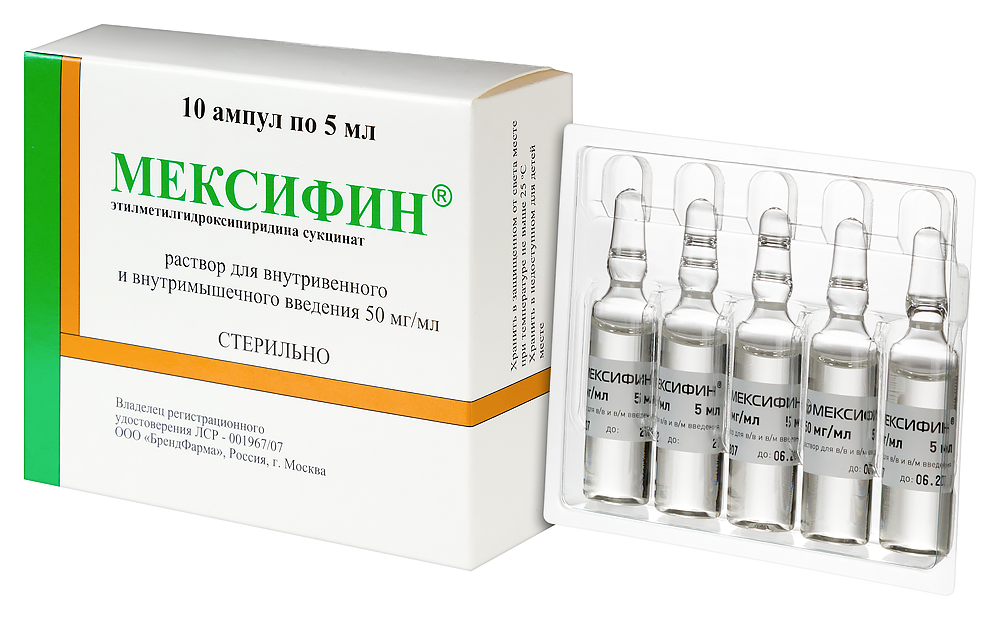 1 амп. 2 этил-6-метил-3-гидроксипиридина сукцинат 100 мг Вспомогательные вещества: вода д/и.