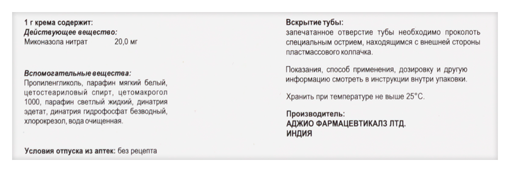 Вспомогательные вещества: пропиленгликоль, парафин мягкий белый, цетостеариловый спирт, цетомакрогол 1000, парафин светлый жидкий, динатрия эдетат, натрия гидрофосфат, хлорокрезол, вода очищенная.