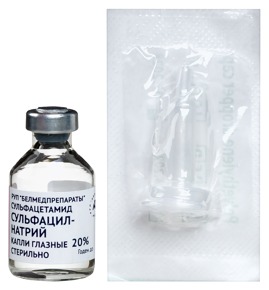 Капли глазные 20 % по 5 мл во флаконы. Флакон вместе с крышкой - капельницей и инструкцией по применению помещают в пачку из картона.