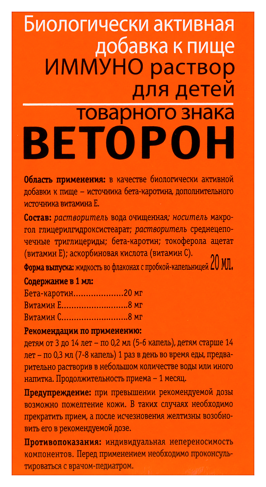 Комбинированный препарат, содержащий комплекс витаминов с выраженной антиоксидантной активностью. Активные компоненты препарата Веторон® для детей являются важной составной частью ферментативных систем, участвующих в основных метаболических процессах. Бетакаротен является природным ретинолподобным веществом из группы каротиноидов. Благодаря выраженному антиоксидантному действию защищает клетки от повреждения активным кислородом и предотвращает повреждающее действие свободных радикалов. Защищает макромолекулы и биомембраны клетки от повреждения, обеспечивая тем самым повышение резистентности организма к различным патогенным воздействиям. Участвует в процессе нормального обновления эпителиальных тканей. Защищает кожу от вредного воздействия УФ-лучей, обладает антиксерофтальмическим действием, оказывает нормализующее влияние на формирование и функции эпителиальных тканей, повышает их устойчивость к инфекциям. Витамин Е (альфа-токоферола ацетат) наравне с другими, входящими в состав препарата витаминами, является антиоксидантом. Связывает свободные радикалы, предупреждает образование перекисных соединений, повреждающих клеточные и субклеточные мембраны. Тормозит перекисное окисление ненасыщенных жирных кислот, предупреждает гемолиз эритроцитов. Восстанавливает капиллярное кровообращение, нормализует капиллярную и тканевую проницаемость, повышает устойчивость тканей к гипоксии. Необходим для развития организма, нормальной функции нервной и мышечной систем. Витамин С (аскорбиновая кислота) оказывает метаболическое действие. Участвует в регуляции окислительно-восстановительных процессов, углеводного обмена, свертывания крови, нормальной проницаемости капилляров, образования стероидных гормонов, синтеза коллагена и Жидкость темно-оранжевого цвета со слабым характерным запахом.