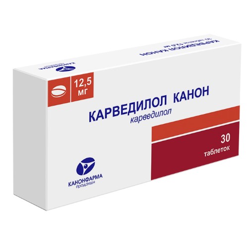 Хроническая сердечная недостаточность У пациентов с хронической сердечной недостаточностью в период подбора дозы препарата может отмечаться нарастание симптомов хронической сердечной недостаточности или задержка жидкости. При возникновении таких симптомов необходимо увеличить дозу диуретиков и не повышать дозу препарата до стабилизации показателей гемодинамики. Иногда бывает необходимо уменьшить дозу препарата Карведилол Канон или, в редких случаях, временно отменить препарат. Подобные эпизоды не препятствуют дальнейшему правильному подбору дозы препарата Карведилол Канон. Карведилол Канон с осторожностью применяют в комбинации с сердечными гликозидами (возможно чрезмерное замедление AV проводимости). В начале терапии препаратом Карведилол Канон или при повышении дозы препарата у пациентов, особенно пожилого возраста, может отмечаться избыточное снижение артериального давления преимущественно при переходе из положения «лежа» в положение «стоя». Необходима коррекция дозы препарата. Функция почек при хронической сердечной недостаточности При назначении препарата Карведилол Канон пациентам с хронической сердечной недостаточностью и низким АД (систолическое АД менее 100 мм рт. ст.), ишемической болезнью сердца и диффузными изменениями сосудов и/или почечной недостаточностью отмечалось обратимое ухудшение функции почек. Дозу препарата подбирают в зависимости от функционального состояния почек. Рекомендуется контролировать функцию почек у пациентов с хронической почечной недостаточностью, артериальной гипотензией и хронической сердечной недостаточностью. ХОБЛ Пациентам с ХОБЛ, в том числе с бронхоспастическим синдромом, не получающим пероральных или ингаляционных противоастматических средств, Карведилол Канон назначают только в том случае, если возможные преимущества его применения превышают потенциальный риск. При наличии исходной предрасположенности к бронхоспастическому синдрому при приеме препарата Карведилол Канон в результате повышения сопротивления дыхательных путей может развиться одышка. В начале приема и при увеличении дозы препарата Карведилол Канон этих пациентов нужно тщательно наблюдать, снижая дозу препарата при появлении начальных признаков бронхоспазма. Сахарный диабет С осторожностью препарат назначают пациентам с сахарным диабетом, поскольку он может маскировать или ослаблять симптомы гипогликемии (особенно тахикардию). У пациентов с хронической сердечной недостаточностью и сахарным диабетом применение препарата Карведилол Канон может сопровождаться нарушениями гликемического контроля. Заболевания периферических сосудов Осторожность необходима при назначении препарата Карведилол Канон пациентам с заболеваниями периферических сосудов, в том числе с синдромом Рейно, поскольку бета-адреноблокаторы могут усиливать симптомы артериальной недостаточности. Тиреотоксикоз Как и другие бета-адреноблокаторы, Карведилол Канон может уменьшать выраженность симптомов тиреотоксикоза. Общая анестезия и обширные хирургические вмешательства Осторожность требуется у пациентов, которым проводится хирургическое вмешательство под общей анестезией, из-за возможности суммации отрицательных эффектов карведилола и средств для общей анестезии. Брадикардия Карведилол 
