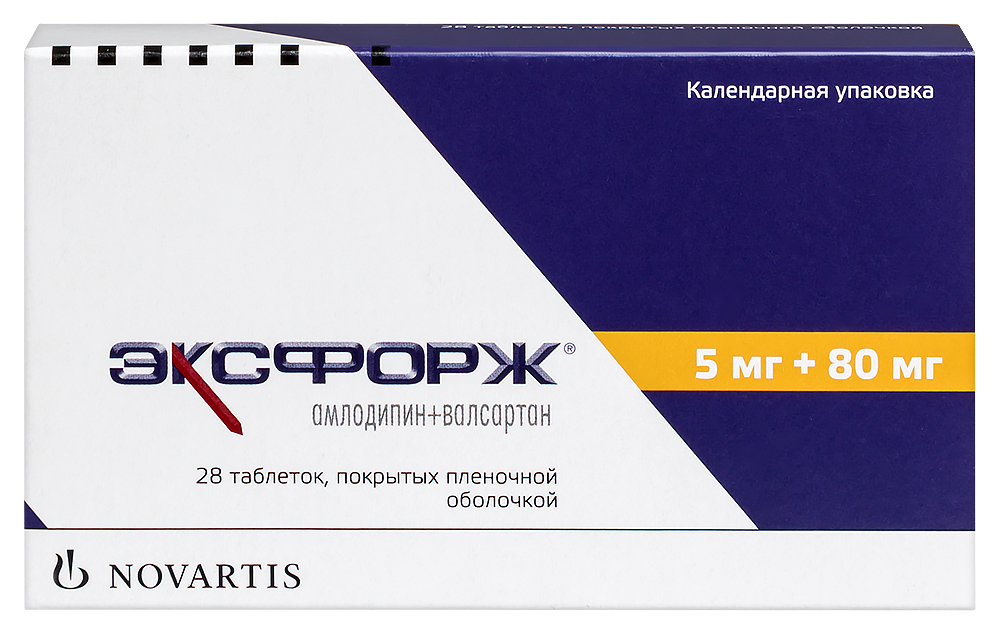 Фармакокинетика валсартана и амлодипина характеризуются линейностью. Амлодипин Всасывание После приема внутрь амлодипина в терапевтических дозах Cmax амлодипина в плазме крови достигается через 6-12 ч. Величина абсолютной биодоступности составляет в среднем 64-80%. Прием пищи не влияет на биодоступность амлодипина. Распределение Vd составляет приблизительно 21 л/кг. В исследованиях с амлодипином in vitro показано, что у пациентов с артериальной гипертензией приблизительно 97.5% циркулирующего препарата связывается с белками плазмы крови. Метаболизм Амлодипин интенсивно (приблизительно 90%) метаболизируется в печени с образованием активных метаболитов. Выведение Выведение амлодипина из плазмы носит двухфазный характер с T1/2 приблизительно от 30 до 50 часов. Css в плазме крови достигаются после продолжительного применения в течение 7-8 дней. 10% неизмененного амлодипина и 60% амлодипина в виде метаболитов выводится почками. Валсартан Всасывание После приема внутрь валсартана Cmax в плазме крови достигается через 2-3 ч. Средняя абсолютная биодоступность составляет 23%. Фармакокинетическая кривая валсартана имеет нисходящий мультиэкспоненциальный характер (T1/2а <1 ч и T1/2бет около 9 ч). При приеме валсартана с пищей отмечается снижение биодоступности (по значению AUC) на 40% и Cmax в плазме крови почти на 50%, хотя приблизительно через 8 ч после приема препарата концентрации валсартана в плазме крови в группе пациентов, принимавших его с пищей, и в группе, принимавшей натощак, выравниваются. Уменьшение AUC, однако, не сопровождается клинически значимым снижением терапевтического эффекта, поэтому валсартан можно назначать вне зависимости от времени приема пищи. Распределение Vd валсартана в равновесном состоянии после в/в введения составлял около 17 л, что указывает на отсутствие экстенсивного распределения валсартана в тканях. Валсартан в значительной степени связывается с белками сыворотки крови (94-97%), преимущественно с альбуминами. Метаболизм Валсартан не подвергается выраженному метаболизму (около 20% принятой дозы определяется в виде метаболитов). Гидроксильный метаболит определяется в плазме крови в низких концентрациях (менее чем 10% от AUC валсартана). Этот метаболит фармакологически активен. Выведение Валсартан выводится в основном в неизмененном виде через кишечник (около 83% дозы) и почками (около 13% дозы). После в/в введения, плазменный клиренс валсартана составляет около 2 л/ч и его почечный клиренс составляет 0.62 л/ч (около 30% общего клиренса). T1/2 валсартана составляет 6 ч. Амлодипин/Валсартан После приема внутрь препарата Эксфорж Cmax валсартана и амлодипина достигаются через 3 ч и 6-8 ч соответственно. Скорость и степень абсорбции Эксфоржа эквивалентны биодоступности валсартана и амлодипина при приеме каждого из них в виде отдельных таблеток.