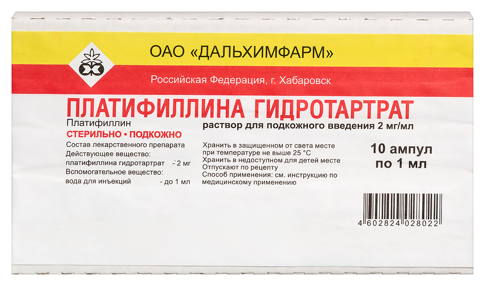 1 мл платифиллина гидротартрат 2 мг В 1 мл раствора содержится 2 мг платифиллина гидротартрата в качестве активного вещества. Вспомогательные вещества: вода для инъекций.