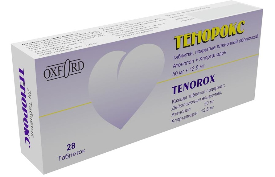 После приема внутрь атенолол всасывается из желудочно-кишечного тракта на 50%. Максимальная концентрация в плазме крови достигается через 2-4 часа после приема внутрь. Атенолол не подвергается выраженному печеночному метаболизму и более 90% абсорбированного препарата выводиться в неизмененном виде. Период полувыведения составляет 6-9 часов, но может увеличиваться в случаях выраженной почечной недостаточности, поскольку выведение данного лекарственного средства происходит, главным образом, через почки. Связывание с белками плазмы примерно - 6-16%. После приема внутрь хлорталидон всасывается из желудочно-кишечного тракта на 60%, максимальная концентрация в плазме крови отмечена примерно через 12 часов после приема препарата внутрь. Период полувыведения составляет примерно 50 часов, и выведение происходит главным образом через почки. Хлорталидон связывается с белками плазмы крови примерно на 75%. Одновременно применение хлорталидона и атенолола оказывает незначительное воздействие на фармакокинетику каждого из них. Тенорокс эффективен по крайней мере в течение 24 часов после разового приема внутрь одной суточной дозы.
