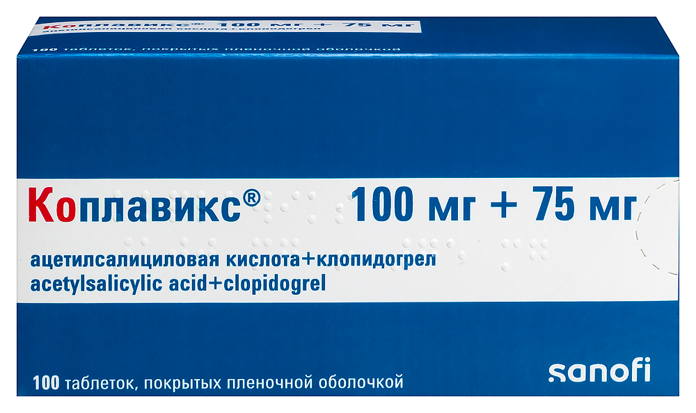 клопидогрела гидросульфат в форме II – 97,875 мг (в пересчете на клопидогрел – 75 мг), ацетилсалициловая кислота – 100 мг;