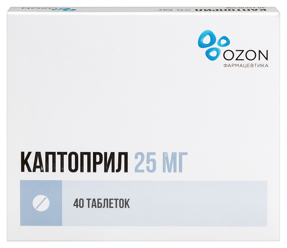 каптоприл 25мг; Вспомогательные вещества: МКЦ; сахар молочный; крахмал картофельный; поливинилпироллидон; магний стеариновокислый; тальк