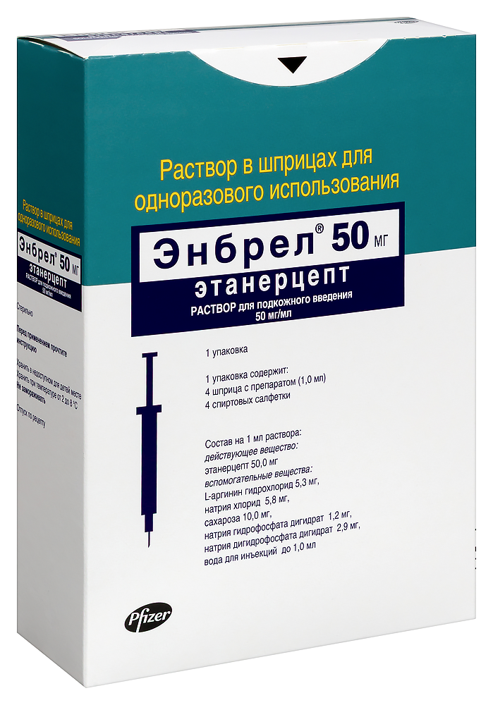 Ревматоидный артрит В комбинации с метотрексатом Энбрел® назначается взрослым при лечении активного ревматоидного артрита средней и высокой степени тяжести, когда ответ на базисные противовоспалительные препараты (БПBП), включая метотрексат, был неадекватным. Энбрел® может назначаться в виде монотерапии в случае неэффективности или непереносимости метотрексата. Энбрел® показан для лечения тяжелого, активного и прогрессирующего ревматоидного артрита у взрослых, не получавших ранее терапии метотрексатом. Ювенильный идиопатический полиартрит Лечение активного ювенильного идиопатического полиартрита (серопозитивного и серонегативного) у детей и подростков в возрасте старше 12 лет и с массой тела более 62,5 кг (для препарата Энбрел в лекарственной форме "раствор для подкожного введения"), у которых наблюдалась недостаточная эффективность или непереносимость метотрексата. Лечение распространенного олигоартрита у детей и подростков в возрасте старше 12 лет и с массой гола более 62,5 кг (для препарата Энбрел® в лекарственной форме "раствор для подкожного введения"), у которых наблюдалась недостаточная эффективность или непереносимость метотрексата. Лечение псориатического артрита у подростков в возрасте старше 12 лет и с массой тела более 62,5 кг (для препарата Энбрел® в лекарственной форме "раствор для подкожного введения"), у которых наблюдалась недостаточная эффективность или непереносимость метотрексата. Лечение артрита, ассоциированного с энтезитами, у подростков в возрасте старше 12 лет и с массой тела более 62,5 кг (для препарата Энбрел® в лекарственной форме "раствор для подкожного введения"), у которых наблюдалась недостаточная эффективность или непереносимость стандартной терапии. Псориатический артрит Лечение активного и прогрессирующего псориатического артрита у взрослых, когда ответ на терапию БПВП был неадекватным. Аксиальная форма спондилоартрита Анкилозирующий спондилит Лечение взрослых с тяжелым активным анкилозирующим спондилитом, у которых традиционная терапия не привела к существенному улучшению. Дорентгенологическая стадия аксиальной формы спондилоартрита Этанерцепт показан для лечения взрослых пациентов с тяжелым течением дорентгенологической стадии аксиальной формы спондилоартрита, у которых отмечался неадекватный ответ или резистентность к стандартной терапии, а также имеются объективные признаки активности заболевания, подтвержденные повышением концентрации С-реактивного белка (СРБ) и/или данными МРТ-сканирования. Псориаз Лечение взрослых с псориазом умеренной и тяжелой степенью выраженности, у которых имеются противопоказания или непереносимость другой системной терапии, включающей циклоспорин, метотрексат или PUVA-терапию. Лечение детей в возрасте старше 12 лет и с массой тела более 62,5 кг (для препарата Энбрел® в лекарственной форме "раствор для подкожного введения") с хроническим псориазом тяжелой степени выраженности, у которых наблюдалась непереносимость или недостаточный ответ на другую системную или фототерапию.