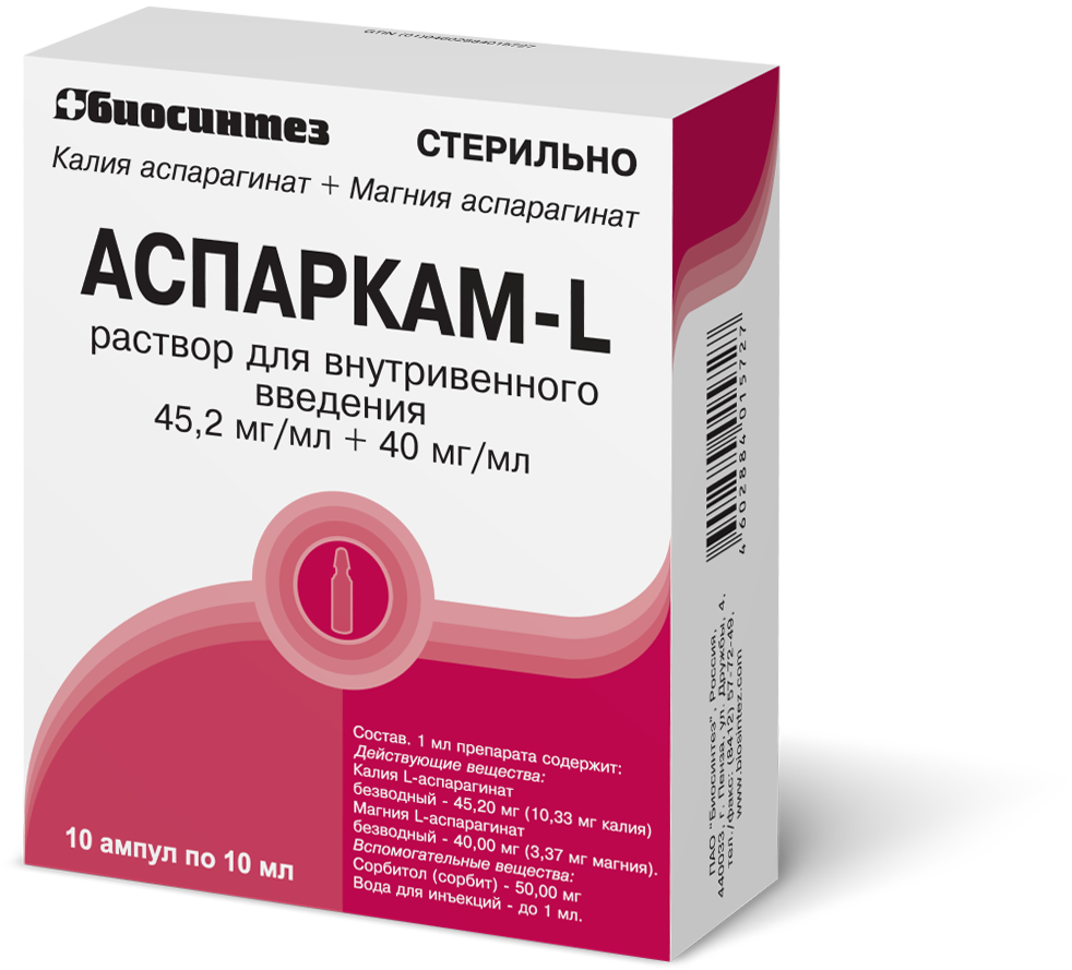 калия L-аспарагината безводного 45,2 мг (калий-ионов 10,33 мг), магния L-аспарагината безводного 40,0 мг (магний ионов - 3,37 мг), полученные из кислоты L-аспарагиновой, магния оксида, калия гидроокиси (калия гидроксида).