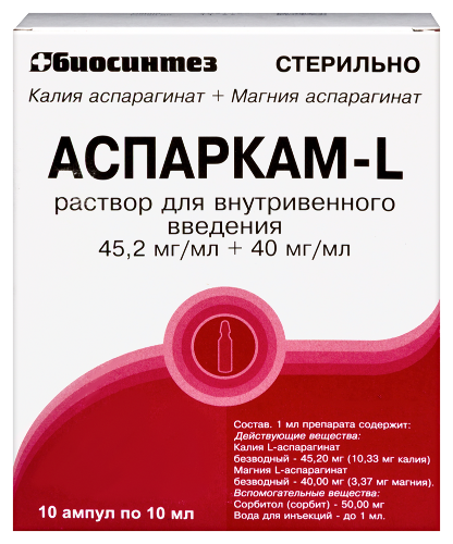 • Аспаркам-l 45,2 мг/мл + 40 мг/мл 10 шт. ампулы раствор для внутривенного введения 10 мл