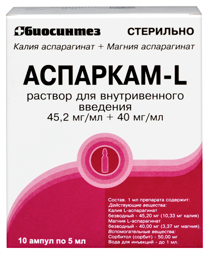 • Аспаркам-l 45,2 мг/мл + 40 мг/мл 10 шт. ампулы раствор для внутривенного введения 5 мл