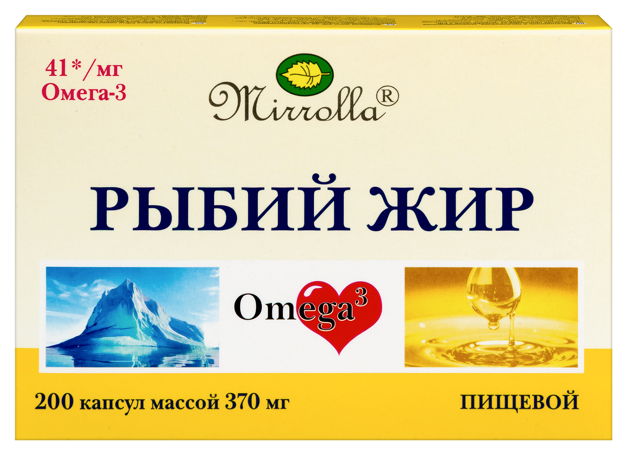 Рыбий жир «Мирролла» с витаминами А, Д, Е Мягкие желатиновые капсулы сферической формы, прозрачные, от светло-желтого до темно-желтого цвета. Продукт производится из жира норвежского лосося и отвечает европейскому стандарту качества и безопасности. Является источником Омега-3 кислот (в т.ч. эйкозапентаеновой кислоты, докозагексаеновой кислоты), которые играют важную роль в функционировании организма и поддержании здоровья человека.