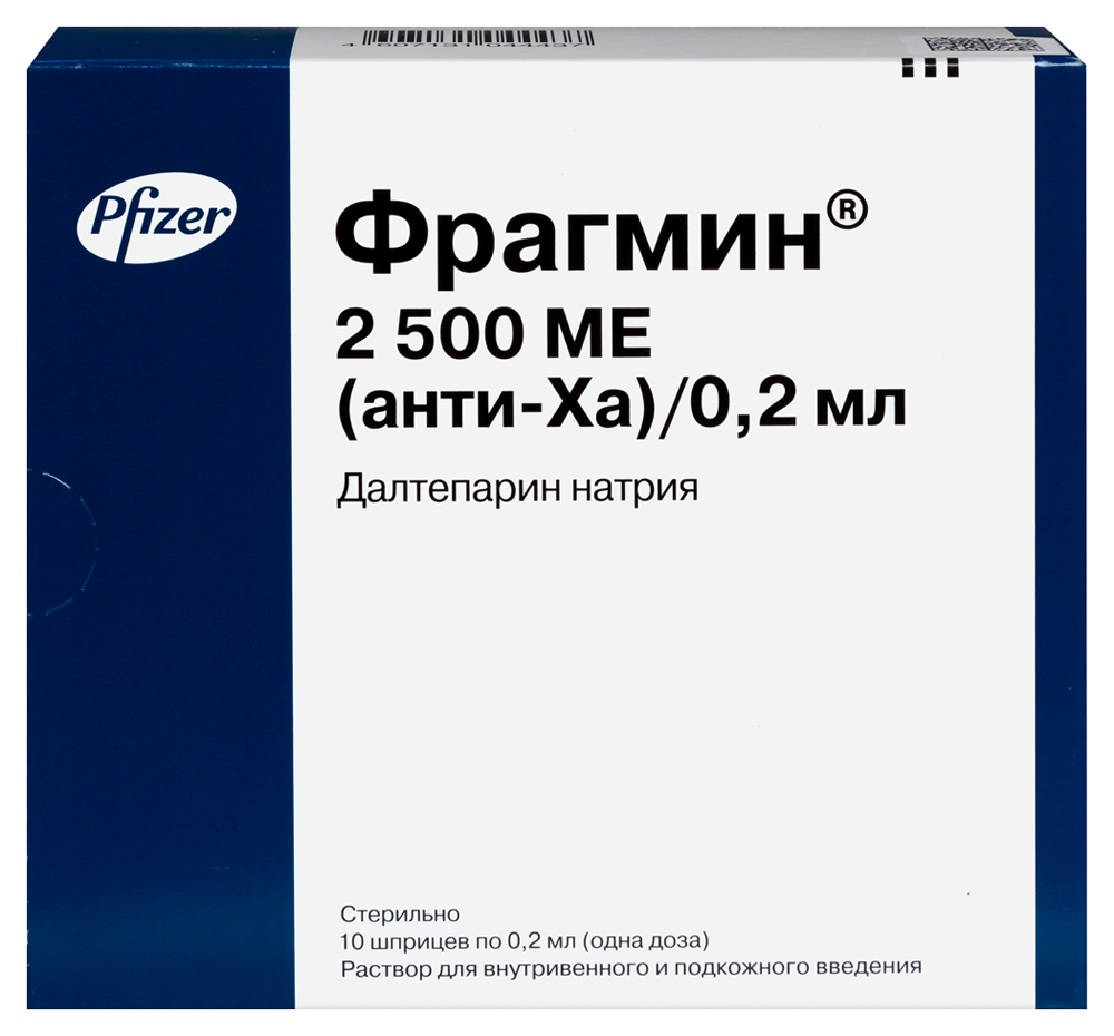Раствор для внутривенного и подкожного введения по 2 500 ME (анти-Ха)/0,2 мл, помещают в шприц из стекла - 10 шт в уп.