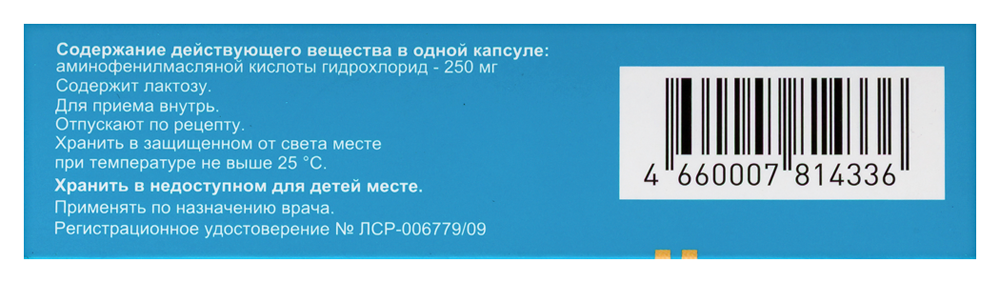 Состав (на одну капсулу) Действующее вещество: аминофенилмасляной кислоты гидрохлорид - 250 мг Вспомогательные вещества: гипролоза - 2,0 мг, кремния диоксид коллоидный - 8,0 мг, лактоза - 86,5 мг, магния стеарат - 3,5 мг. Капсулы твердые желатиновые содержат: воду, желатин, краситель азорубин (Е 122), краситель бриллиантовый голубой (Е 133), титана диоксид (Е 171).