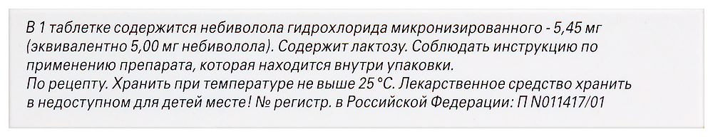 Небиволола гидрохлорид микронизированный 5.45 мг, что соответствует содержанию небиволола 5 мг Вспомогательные вещества: лактозы моногидрат, крахмал кукурузный, натрия кроскармеллоза, гипромеллоза, полисорбат 80, целлюлоза микрокристаллическая, кремния диоксид высокодисперсный, магния стеарат.