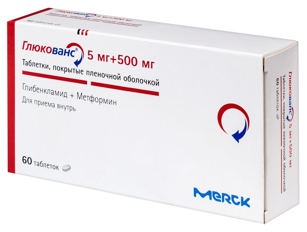 Глибенкламид. При приеме внутрь абсорбция из желудочно-кишечного тракта составляет более 95%. Глибенкламид, входящий в состав препарата Глюкованс® является микронизированным. Пик концентрации в плазме достигается примерно за 4 часа, объем распределения - около 10 л. Связь с белками плазмы составляет 99%. Почти полностью метаболизируется в печени с образованием двух, неактивных метаболитов, которые выводятся почками (40 %) и с желчью (60 %). Период полувыведения - от 4 до 11 часов. Метформин после приема внутрь абсорбируется из желудочно-кишечного тракта достаточно полно, пик концентрации в плазме достигается в течение 2,5 часов. Примерно 20- 30% метформина выводится через желудочно-кишечный тракт в неизменном виде. Абсолютная биодоступность составляет от 50 до 60%. Метформин быстро распределяется в тканях, практически не связывается с белками плазмы. Подвергается метаболизму в очень слабой степени и выводится почками. Период полувыведения составляет в среднем 6,5 часов. При нарушении функции почек, почечный клиренс снижается, так же как и клиренс креатинина, при этом период полувыведения увеличивается, что приводит к увеличению концентрации метформина в плазме крови. Сочетание метформина и глибенкламида в одной лекарственной форме имеет ту же биодоступность, что и при приеме таблеток, содержащих метформин или глибенкламид изолированно. На биодоступность метформина в сочетании с глибенкламидом не влияет прием пищи, так же, как и на биодоступность глибенкламида. Однако скорость абсорбции глибенкламида возрастает при приеме пищи.