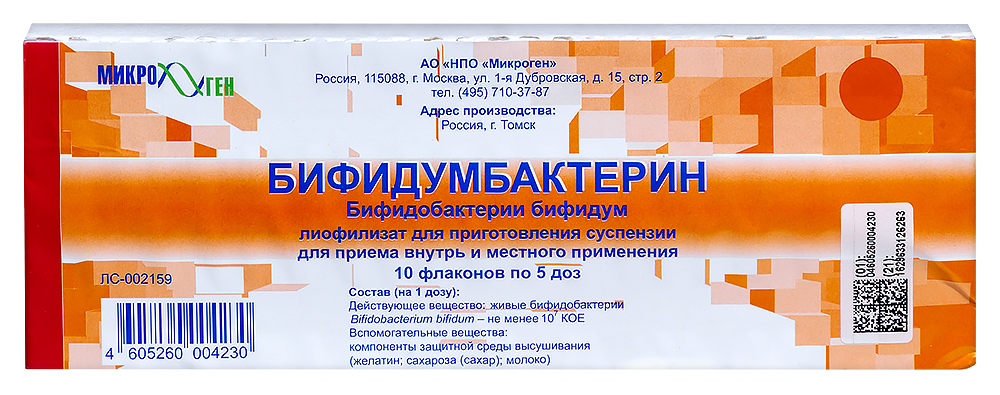Одна доза препарата содержит не менее 10? живых бифидобактерий. Препарат содержит среду культивирования и компоненты среды высушивания: желатин - от 0,7 до 3,0%, сахароза - от 5 до 10%; молоко обезжиренное - от 15 до 25%.