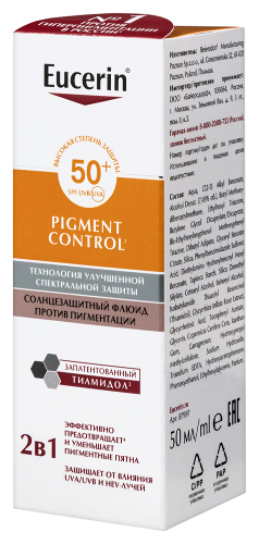 Eucerin флюид солнцезащитный против пигментации spf 50+ 50 мл - это ежедневный солнцезащитный крем для лица для всех типов кожи, который помогает предотвратить вызываемую солнцем гиперпигментацию (веснушки). Эффективно уменьшает темные пятна и предотвращает их повторное появление. Благодаря улучшенной спектральной технологии, сочетающей широкополосные и фотостабильные фильтры UVA/UVB* и ликохалкон А, флюид эффективно защищает от фотостарения и нейтрализует свободные радикалы, возникающие под воздействием солнечного излучения. В состав солнцезащитного крема также входит глицерретиновая кислота, стимулирующая собственные механизмы восстановления ДНК в клетках кожи. Продукт обогащен тиамидолом - инновационным компонентом Eucerin, воздействующим на избыточную выработку меланина - первопричину гиперпигментации. При регулярном использовании тиамидол уменьшает существующие пигментные пятна и предотвращает возникновение новых.