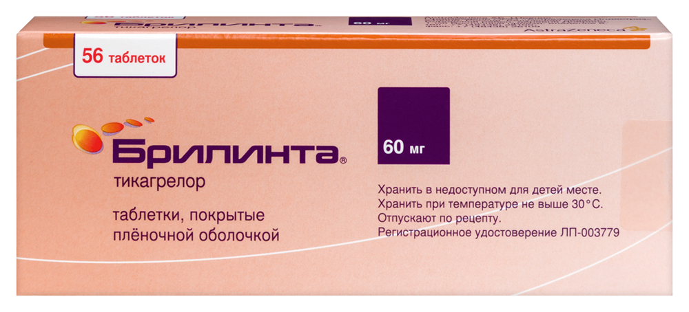 Тикагрелор демонстрирует линейную фармакокинетику, и экспозиция тикагрелора и активного метаболита (AR-C124910XX) примерно пропорциональна дозе вплоть до 1260 мг. Абсорбция Тикагрелор быстро абсорбируется со средней tmax примерно 1,5 часа. Формирование основного циркулирующего в крови метаболита AR-C124910XX (также активного) из тикагрелора происходит быстро со средней tmax примерно 2,5 часа. После приема натощак тикагрелора в дозе 90 мг Сmax составляет 529 нг/мл и AUC - 3451 нг*ч/мл. Средняя абсолютная биодоступность тикагрелора составляет 36%. Прием жирной пищи не влияет на Сmax тикагрелора или AUC активного метаболита, но приводит к повышению на 21% AUC тикагрелора и снижению на 22% Сmax активного метаболита. Эти небольшие изменения имеют минимальную клиническую значимость; поэтому тикагрелор можно назначать вне зависимости от времени приема пищи. Тикагрелор в виде суспензии измельченных таблеток в питьевой воде, принятой внутрь или введенной в желудок через назогастральный зонд, биоэквивалентен тикагрелору, принятому внутрь в виде таблеток препарата Брилинта® (AUC и Сmax тикагрелора и активного метаболита в диапазоне 80-125%). В случае приема суспензии первоначальная экспозиция (через 0,5 ч и 1 ч после приема) была выше, чем при приеме тикагрелора в виде таблеток препарата Брилинта®, но в дальнейшем (от 2 до 48 часов) профиль концентраций был практически одинаковым. Распределение Объем распределения тикагрелора в равновесном состоянии составляет 87,5 л. Тикагрелор и активный метаболит активно связываются с белками плазмы крови (> 99%). Метаболизм CYP3A4 является основным изоферментом, отвечающим за метаболизм тикагрелора и формирование активного метаболита, и их взаимодействия с другими субстратами CYP3A варьируют от активации до ингибирования. Тикагрелор и активный метаболит являются слабыми ингибиторами гликопротеина Р (P-gp). Основным метаболитом тикагрелора является AR-C124910XX, который также активен, что подтверждается результатами оценки связывания с P2Y12-рецептором АДФ тромбоцитов in vitro. Системная экспозиция активного метаболита составляет примерно 30-40% от экспозиции тикагрелора. Экскреция Основной путь выведения тикагрелора - через печеночный метаболизм. При введении меченного изотопом тикагрелора в среднем примерно 57,8% радиоактивности выделяется с фекалиями, 26,5% с мочой. Выведение тикагрелора и активного метаболита с мочой составляет менее 1% дозы. В основном активный метаболит выводится с желчью. Средний период полувыведения тикагрелора и активного метаболита составлял 7 и 8,5 часов, соответственно. Особые популяции пациентов Пожилые пациенты У пожилых пациентов (в возрасте от 75 лет и старше) отмечена более высокая экспозиция тикагрелора (Сmax и AUC примерно на 25% выше) и активного метаболита по сравнению с молодыми пациентами. Эти различия не считаются клинически значимыми (см. раздел "Способ применения и дозы"). Дети Нет данных по применению тикагрелора у детей. Пол У женщин отмечена более высокая экспозиция тикагрелора и активного метаболита по сравнению с мужчинами. Эти различия не считаются клинически значимыми. Этнические группы Средняя биодоступность препарата у пациентов-азиатов на 39% выше, чем у европеоидов. Биодоступность препарата Брилинта® на 18% ниже у пациентов негроидной расы по сравнению с пациентами европеоидной расы. Почечная недостаточност