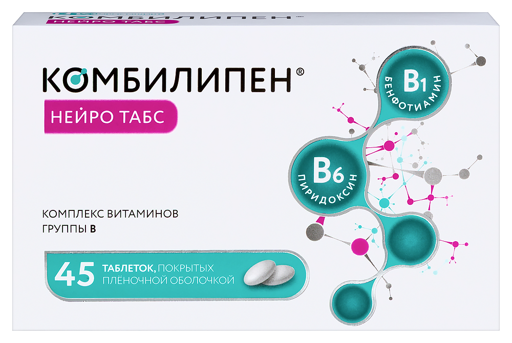бенфотиамин 100 мг пиридоксина гидрохлорид (вит. B6) 100 мг цианокобаламин (вит. B12) 2 мкг Вспомогательные вещества: кармеллоза (карбоксиметилцеллюлоза), повидон (коллидон 30), целлюлоза микрокристаллическая, тальк, кальция стеарат (кальция октадеканоат), полисорбат 80 (твин 80), сахароза (сахар). Состав оболочки: гипролоза (гидроксипропилцеллюлоза), макрогол (полиэтиленоксид 4000), повидон (поливинилпирролидон низкомолекулярный медицинский), титана диоксид, тальк.