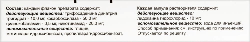 Каждая ампула препарата содержит: активные компоненты: трифосаденина динатрия тригидрат - 10,0 мг, кокарбоксилаза - 50,0 мг, цианокобаламин - 0,5 мг, никотинамид - 20,0 мг; вспомогательные вещества: глицин – 105,875 мг, метилпарагидроксибензоат – 0,6 мг, пропилпарагидроксибензоат – 0,15 мг. Каждая ампула растворителя содержит: Лидокаина гидрохлорид – 10 мг, вода для инъекций – до 2 мл.