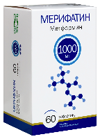 Сообщите лечащему врачу или работнику аптеки о том, что Вы принимаете, недавно принимали или можете начать принимать какие-либо другие препараты. Йодсодержащие рентгеноконтрастные средства: на фоне функциональной почечной недостаточности у пациентов с сахарным диабетом радиологическое исследование с применением йодсодержащих рентгеноконтрастных средств может вызывать развитие лактоацидоза. Лечение Мерифатином необходимо отменить в зависимости от функции почек за 48 ч до или на время рентгенологического исследования с применением йодсодержащих рентгеноконтрастных средств и не возобновлять ранее 48 ч после, при условии, что в ходе обследования функция почек была признана нормальной. Комбинации, требующие осторожности Даназол: не рекомендуется одновременный прием даназола во избежание гипергликемического действия последнего. Требуется коррекция дозы препарата Мерифатин под контролем концентрации глюкозы в крови. Нейролептик (хлорпромазин): при приеме в больших дозах (100 мг в день) повышает концентрацию глюкозы в крови, снижая высвобождение инсулина. При лечении нейролептиками и после прекращения приема последних требуется коррекция дозы препарата Мерифатин под контролем концентрации глюкозы в крови. Глюкокортикостероиды (ГКС) системного и местного действия снижают привыкание к глюкозе, повышают концентрацию глюкозы в крови, иногда вызывая углеводное голодание клеток (кетоз). При лечении ГКС и после прекращения приема последних требуется коррекция дозы препарата Мерифатин под контролем концентрации глюкозы в крови. Диуретики: одновременный прием «петлевых» диуретиков может привести к развитию стойкого повышения уровня молочной кислоты в крови (лактоацидоза) из-за возможной функциональной почечной недостаточности. Вам не следует принимать препарат Мерифатин, если клиренс креатинина ниже 60 мл/мин. Назначаемые в инъекционной форме вещества, вызывающие стимуляцию β-адренергических рецепторов (бета2-адреномиметики): повышают концентрацию глюкозы в крови вследствие стимуляции бета2-адренорецепторов. В этом случае необходим контроль концентрации глюкозы в крови. При необходимости Ваш врач может назначить инсулин. При одновременном применении вышеперечисленных лекарственных средств может потребоваться более частый контроль содержания глюкозы в крови, особенно в начале лечения. При необходимости доза препарата Мерифатин может быть скорректирована в процессе лечения и после его прекращения. Лекарственные средства, снижающие артериальное давление (гипотензивные лекарственные средства), за исключением ингибиторов ангиотензинпревращающего фермента, могут снижать концентрацию глюкозы в крови. При необходимости следует скорректировать дозу препарата Мерифатин. При одновременном применении препарата Мерифатин с гипогликемическими синтетическими средствами (производными сульфонилмочевины, инсулином, акарбозой, салицилатами) возможно развитие гипогликемии. Блокатор «медленных» кальциевых каналов (нифедипин) повышает всасывание (абсорбцию) и величину максимальной концентрации в плазме крови (Сmах) препарата Мерифатин. Катионные лекарственные средства (амилорид, дигоксин, морфин, прокаинамид, хинидин, хинин, ранитидин, триамтерен, триметоприм и ванкомицин), секретирующиеся в почечных канальцах,