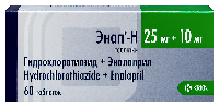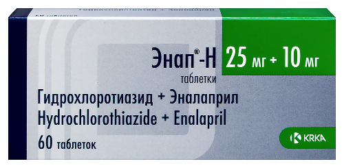 Препарат Энап® - Н, как правило, хорошо переносится. В клинических исследованиях побочные эффекты обычно были легкими, преходящими и не требовали прерывания лечения. При применении комбинации гидрохлоротиазид + эналаприл наблюдались следующие нежелательные явления (очень часто: ≥ 10 %, часто: ≥ 1 % и < 10 %, нечасто: ≥ 0,1 % и < 1 %, редко: ≥ 0,01 % и < 0,1 %, очень редко: < 0,01 %, частота неизвестна: невозможно оценить частоту на основании доступных данных): Нарушения со стороны крови и лимфатической системы нечасто: анемия (включая апластическую и гемолитическую); редко: нейтропения, снижение гемоглобина, снижение гематокрита, тромбоцитопения, агранулоцитоз, угнетение костно-мозгового кроветворения, лейкопения, панцитопения, лимфаденопатия, аутоиммунные заболевания. Нарушения со стороны эндокринной системы частота неизвестна: синдром неадекватной секреции антидиуретического гормона. Нарушения со стороны обмена веществ и питания часто: гипокалиемия, увеличение концентрации холестерина и триглицеридов в плазме крови, гиперурикемия; нечасто: гипогликемия (см. раздел «Особые указания»), гипомагниемия, обострение течения подагры*; редко: увеличение концентрации глюкозы в крови. очень редко: гиперкальциемия (см. раздел «Особые указания»). Нарушения со стороны нервной системы и нарушения психики часто: головная боль, депрессия, обморок, изменение вкуса; нечасто: спутанность сознания, сонливость, бессонница, повышенная нервозность, парестезия, системное головокружение, снижение либидо*; редко: необычные сновидения, нарушения сна, парезы (по причине гипокалиемии). Нарушения со стороны органа зрения очень часто: нечеткость зрительного восприятия Нарушения со стороны органа слуха и лабиринтные нарушения нечасто: шум в ушах. Нарушения со стороны сердца и сосудов очень часто: головокружение; часто: выраженное снижение АД, ортостатическая гипотензия, нарушение ритма, стенокардия, тахикардия. нечасто: ощущение «приливов» крови к коже лица, ощущение сердцебиения, инфаркт миокарда или инсульт**, возможно, вторичные по отношению к выраженной артериальной гипотензии у пациентов, относящихся к группе высокого риска (см. раздел «Особые указания»); редко: синдром Рейно. Нарушения со стороны дыхательной системы, органов грудной клетки и средостения очень часто: кашель; часто: одышка; нечасто: ринорея, боль в горле, охриплость голоса, бронхоспазм/бронхиальная астма; редко: легочные инфильтраты, респираторный дистресс-синдром (включая пневмонит и отек легких), ринит, аллергический альвеолит/эозинофильная пневмония. Нарушения со стороны пищеварительной системы очень часто: тошнота; часто: диарея, боль в области живота; нечасто: кишечная непроходимость, панкреатит, рвота, диспепсия, запор, анорексия, раздражение желудка, сухость слизистой оболочки полости рта, язва желудка и двенадцатиперстной кишки, метеоризм*; редко: стоматит/афтозные язвы, глоссит; очень редко: интестинальный отек. Нарушения со стороны печени и желчевыводящих путей редко: печеночная недостаточность, некроз печени (возможно с летальным исходом), гепатит (гепатоцеллюлярный или холестатический), желтуха, холецистит (особенно у пациентов с желчнокаменной болезнью в анамнезе). Нарушения со стороны кожи и подкожных тканей часто: кожная сыпь (экзантема), реакции гиперчувствительности/ангионев