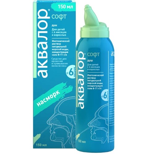 Аквалор «Софт» - изотонический раствор морской воды для деликатного орошения и промывания полости носа. Средство обладает увлажняющим действием. Подходит для детей с 6 месяцев и взрослых.