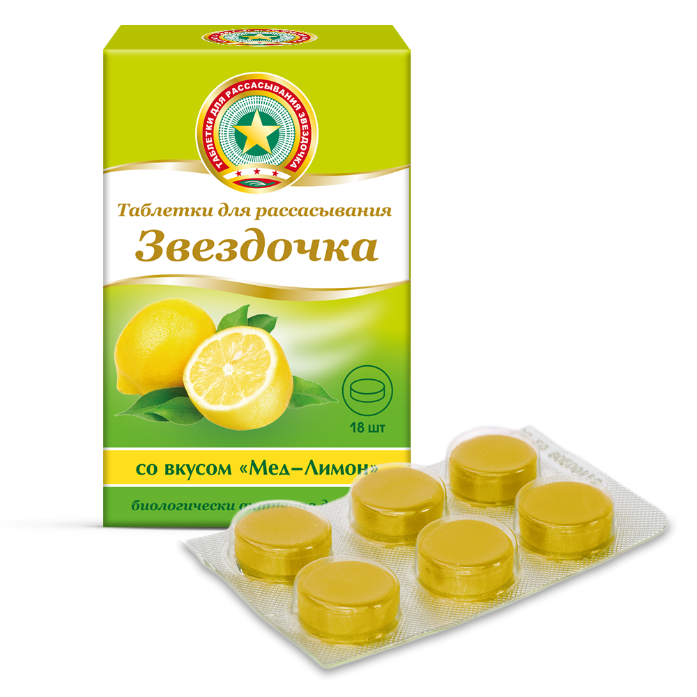 ЗВЕЗДОЧКА МЕД-ЛИМОН - Биологически активная добавка (БАД) к пище, таблетки для рассасывания Внешний вид и свойства: Круглые двояковыпуклые таблетки для рассасывания массой 2,4 г со вкусом мёда-лимона. Допускается неоднородность окрашивания, наличие пузырьков воздуха в карамельной массе и незначительные неровности краёв.