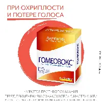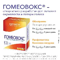 Гомеовокс - это гомеопатический лекарственный препарат, применяемый при ларингитах различной этиологии, в т.ч. потеря голоса, хрипота, усталость голосовых связок. Гомеовокс способствует восстановлению голоса при нарушениях, вызванных самыми разными причинами. Улучшение качества голоса (нормализация тембра, звучности, звонкости) отмечается уже с первых дней приема Гомеовокс. Гомеовокс можно применять также с целью профилактики, если вас ожидают повышенные голосовые нагрузки (например, лекции, выступления, репетиции). Гомеовокс подходит для взрослых и детей с 6 лет. Доказанно действует с первых дней применения. Таблетки для рассасывания. При необходимости можно растворить в воде. Отсутствие зарегистрированных побочных эффектов. Перед применением рекомендуется проконсультироваться с врачом.