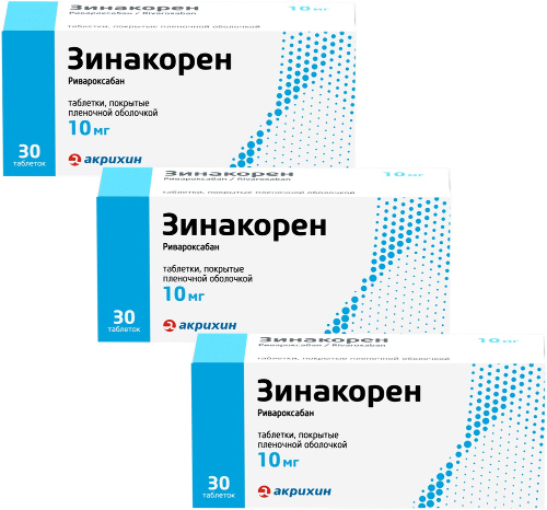 Предупреждение образования тромбов в венах у пациентов после больших ортопедических операций на ногах: Первую таблетку препарата Зинакорен примите через 6-10 часов после хирургического вмешательства. Длительность лечения после обширного хирургического вмешательства на тазобедренном суставе обычно составляет 5 недель, на коленном суставе - 2 недели.