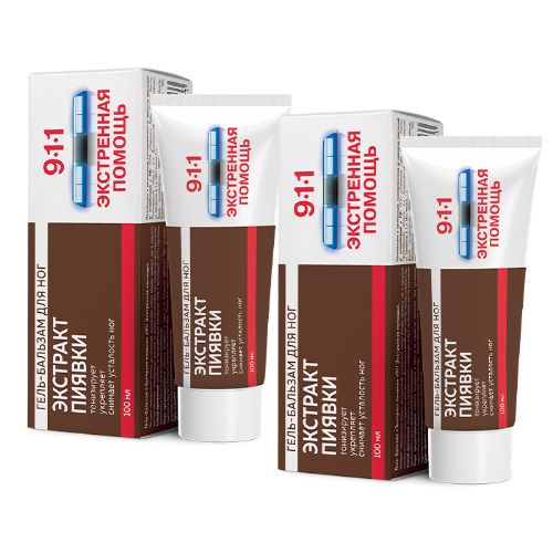 911 ЭКСТРЕННАЯ ПОМОЩЬ ЭКСТРАКТ ПИЯВКИ ГЕЛЬ-БАЛЬЗАМ - экстракт медицинской пиявки, дополненный экстрактами гинкго билоба, зеленого чая и конского каштана. Оказывает тонизирующее действие на область ног, усиливает микроциркуляцию и способствует снятию напряжения и усталости ног.
