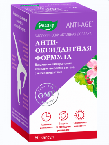 Общеукрепляющий комплекс для защиты от преждевременного старения. Витамины, минералы, аминокислоты, растительные экстракты антиоксидантного действия способствуют защите от свободных радикалов и негативных факторов окружающей среды, сохранению молодости и активному долголетию. Направленность действия БАД определяется входящими в ее состав компонентами. Витамины В2, В6, С, Е, А - являются витаминами-антиоксидантами. Лютеин и зеаксантин– каротиноиды-антиоксиданты. Защищают от свободных радикалов глаза, органы сердечно-сосудистой и репродуктивной систем, кожу. Цинк, медь, селен, марганец – регулируют активность ферментов в организме. Глутатион, ацетилцистеин, таурин – являются основными компонентами антиоксидантной защиты организма, активно обезвреживают токсины. Экстракты гинкго билоба, расторопши, клюквы, листьев винограда, зеленого чая, шиповника, дигидрокверцетин, перца черного – являются источником биофлавоноидов – растительных антиоксидантов. Прием 2 капсул обеспечивает потребление 250 мг витамина С (на 416,6 %, что не превышает верхний допустимый уровень потребления), 3 мг рибофлавина (на 187,5 %, что не превышает верхний допустимый уровень потребления), 0,7 мг витамина А (на 87,5 %), 67 мг витамина Е (на 670 %, что не превышает верхний допустимый уровень потребления), 3 мг витамина В6 (на 150 %, что не превышает верхний допустимый уровень потребления), 2 мг марганца (на 100 %), 0,5 мг меди (на 50 %), 5 мг цинка (33,3 %), 0,025 мг селена (на 35,7 %*).
