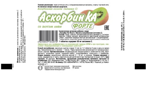 Аскорбин ка форте таблетки жевательные /киви/ - это биологически активная добавка (БАД) к пище. Профилактика дефицита витамина C (недостаточное поступление с пищей, повышенная потребность организма). Взрослым и детям старше 14 лет по 1-2 таблетки 2 раза в день во время еды.