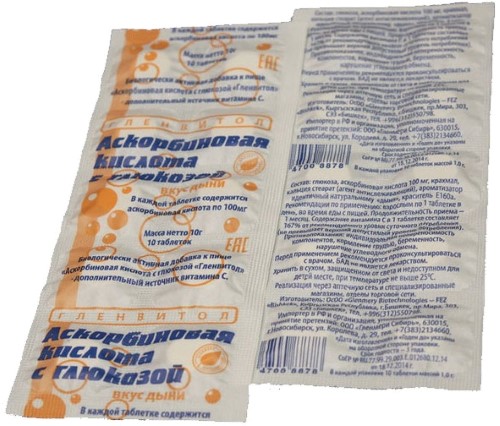 Глюкоза, аскорбиновая кислота 100 мг, крахмал, кальция стеарат (агент антислеживающий), ароматизатор идентичный натуральному «дыня», краситель Е160a.