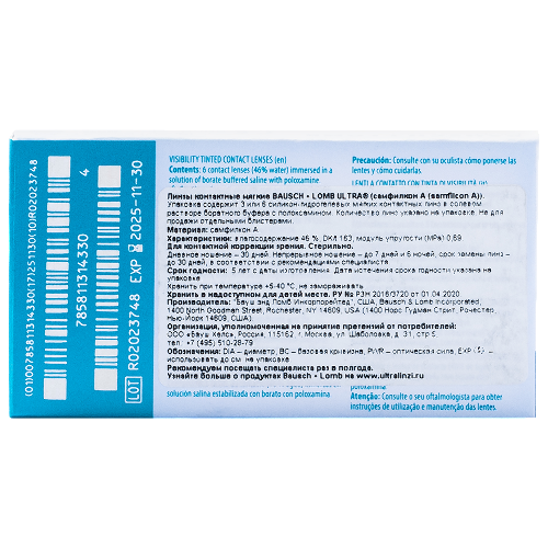 Bausch&lomb ultra контактные линзы плановой замены - это мягкие силикон-гидрогелевые контактные линзы предназначены для оптической коррекции зрения лиц, не имеющих заболеваний глаз и с минимальной степенью астигматизма, не влияющей на качество зрения. Базовая кривизна - 8,5 мм Диаметр - 14,2 мм Режим замены - ежемесячный (раз в 30 дней). Линзы следует выбрасывать и заменять новой парой каждый месяц! Это оптимальный выбор для людей, которые ценят постоянство и предпочитают линзы плановой замены: 3 шт в упаковке. Особенность линз заключается в новой технологии двухфазной полимеризации MoistureSeal которая позволила усовершенствовать ключевые параметры линзы: высокое влагосодержание, низкий модуль упругости и высокую проницаемость для кислорода.Ультратонкий край, асферический дизайн задней поверхности и удивительная мягкость линзы делает ее неощутимой на глазу сразу после надевания. Устойчивость материала линзы к высыханию помогает предотвратить ухудшение четкости зрения и появление симптомов сухости даже при длительной зрительной нагрузке, что особенно важно активным пользователям электронных устройств.Так же комфортны в конце дня после длительной зрительной нагрузки, как и сразу после надевания. Линзы выполнены из высококачественного материала - Самфилкон А, силикон-гидрогель, который обеспечивает комфорт в течение месяца ношения. Режим ношения дневной. Для сохранения здоровья глаз необходимо очищать и дезинфицировать линзы в промежутках между ношением. Для гигиенически безопасного и комфортного использования такие изделия нужно подвергать очистке с помощью специальных многофункциональных растворов или пероксидных систем. Обращаем Ваше внимание, что контактные линзы - это медицинское изделие, контактирующее с поверхностью глаза, поэтому рекомендации по их подбору, ношению, уходу может давать только врач-офтальмолог или оптик-оптометрист при личной консультации, так как только таким образом возможно безопасное использование контактных линз.