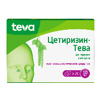 Механизм действия Цетиризин - активное вещество препарата Цетиризин-Тева - является метаболитом гидрок-сизина, обладает антигистаминным эффектом с противоаллергическим действием. Цети-ризин относится к группе конкурентных антагонистов гистамина и блокирует H1-гистаминовые рецепторы с небольшим воздействием на другие рецепторы и практически не оказывает антихолинергического и антисеротонинового действия. Цетиризин оказывает влияние на гистаминзависимую стадию аллергических реакций не-медленного действия, а также уменьшает миграцию эозинофилов и ограничивает высво-бождение медиаторов при аллергических реакциях замедленного типа. Практически не проходит через гематоэнцефалический барьер и, следовательно, почти не способен достичь центральных рецепторов H1. Фармакодинамические свойства В исследованиях влияния гистамина на кожу действие цетиризина в дозе 10 мг начиналось через 1 час, достигало максимума со 2-го по 12-й час и все еще наблюдалось на статистически значимых уровнях через 24 часа. В дополнение к антигистаминному эффекту цетиризин также обладает противовоспалительным эффек-том и тем самым оказывает влияние на позднюю фазу аллергической реакции: