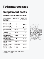 Количество в 1 порции (1 капсула): Витамин В1(тиамина гидрохлорид) 5 мг 357% от уровня потребления Витамин В2(рибофлавин-5-фосфат) 6 мг 375% от уровня потребления Витамин В3(никотинамид) 20 мг 111% от уровня потребления Холин(холина битартрат) 50 мг 10% от уровня потребления Витамин В5(пантотеновая кислота) 15 мг 250% от уровня потребления Витамин В6(пиридоксаль-5-фосфат) 6 мг 300% от уровня потребления Витамин В7(биотин) 75 мкг 150% от уровня потребления Витамин В9(метилфолат) 500 мкг 250% от уровня потребления Витамин В12(метилкобаламин) 9 мкг 900% от уровня потребления