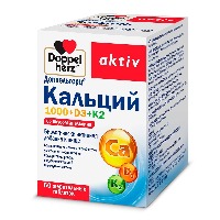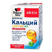 ДОППЕЛЬГЕРЦ АКТИВ КАЛЬЦИЙ 1000+D3+K2 СО ВКУСОМ АПЕЛЬСИНА - Биологически активная добавка (БАД) к пище - Компоненты комплекса способствуют укреплению костной ткани, поддержанию работы сердечно-сосудистой и иммунной систем. 2 таблетки содержат: Кальций 1000 мг, % от рекомендуемого уровня суточного потребления 100 Витамин D3 10 мкг, % от рекомендуемого уровня суточного потребления 200* Витамин К2 75 мкг, % от рекомендуемого уровня суточного потребления 63** *Не превышает верхний допустимый уровень потребления. **Адекватный уровень потребления Пищевая и энергетическая ценность: 2 таблетки содержат 22 кДж/ 6 ккал, жиры 0 г, белки 0 г, углеводы 1,2 г. Кальций - является основным компонентом костей и зубов. Кроме этого регулирует работу нервной системы, участвует в тромбообразовании - основном механизме свертывания крови, защищающего нас от чрезмерной кровопотери, способствует правильному формированию мышечной системы. При недостатке кальция в рационе взрослого человека, наблюдаются частые "спонтанные" переломы костей (остеопороз), истирание и разрушение зубов, возникает кариес. Витамин D - Витамин D3 увеличивает всасывание кальция в тонком кишечнике. Точнее говоря, эту функцию выполняют его производные, образующиеся в организме. Поскольку витамин D регулирует процесс усвоения кальция и фосфора, он играет ключевую роль в нормальном формировании костей и зубов. Витамин D3 также cспособствует функционированию иммунной системы, активируя защитные силы организма. Витамин К - оказывает регулирующее влияние на процессы свертываемости крови, действуя путем стимуляции синтеза в печени соответствующих ферментов. При недостаточности витамина К страдает процесс образования протромбина, а это способствует высокой предрасположенности к кровотечениям. Также Витамин К обеспечивает поддержку деятельности сердечно-сосудистой системы.
