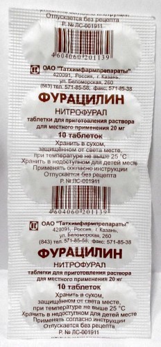Водный 0,02% раствор фурацилина готовят непосредственно перед применением: 1 часть Фурацилина растворяют в 5000 частях 0,9% раствора натрия хлорида или дистиллированной воды. Для более быстрого растворения рекомендуется кипящая или горячая вода. Затем раствор охлаждают до комнатной температуры.