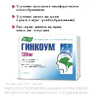 Гинкоум 120 мг - это лекарственный препарат - капсулы, содержащие экстракт листьев гинко билоба. Этот компонент улучшает кровообращение, увеличивает кислородный поток к мозгу, снижает вязкость крови и обладает антиоксидантными свойствами. Препарат улучшает память, концентрацию и внимание, снижает риск развития болезни Альцгеймера и инсульта. Рекомендуется при нарушениях кровообращения в мозге, головокружениях, шуме и звоне в ушах и головной боли. Капсулы принимают по 1 шт. 1-2 раза в день. Длительность терапии до 3-х месяцев, в случае необходимости продолжения терапии следует проконсультироваться с врачом. При двукратном режиме дозирования принимать утром и вечером, при однократном - желательно утром. Если был пропущен прием препарата или было принято недостаточное его количество, последующий его прием следует проводить так, как это указано в инструкции без каких-либо изменений.