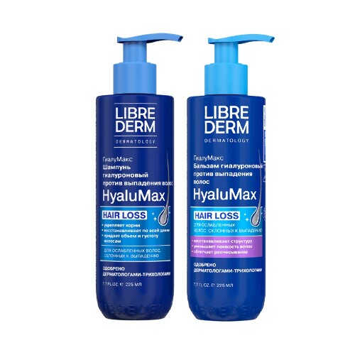 LIBREDERM - международный бренд косметики, который предлагает современные решения для любой дерматологической потребности. Средства коллекции HyaluMax предназначены для бережного и тщательного очищения всех типов волос и чувствительной кожи головы при выпадении, замедлении роста и ухудшении качества волос, подверженных негативному воздействию внешних факторов (укладка, ультрафиолет, холод, неправильный уход), а также внутренним изменениям (стресс, применение лекарств, перенесённые сезонные и вирусные заболевания, в том числе Ковид-19, гормональные колебания, диета). LIBREDERM HyaluMax Бальзам гиалуроновый против выпадения волос . Внешний вид: Кремовая консистенция, белого цвета, приятная на запах